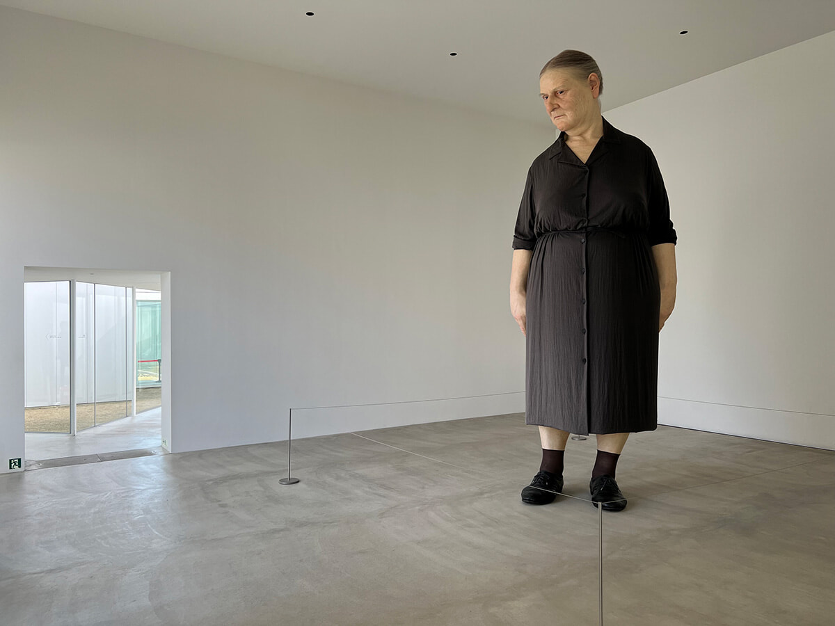 十和田市現代美術館常設展示より、ロン・ミュエク『スタンディング・ウーマン』。高さ4メートル。血管や髪の毛1本1本まで人体が精巧に再現されている。