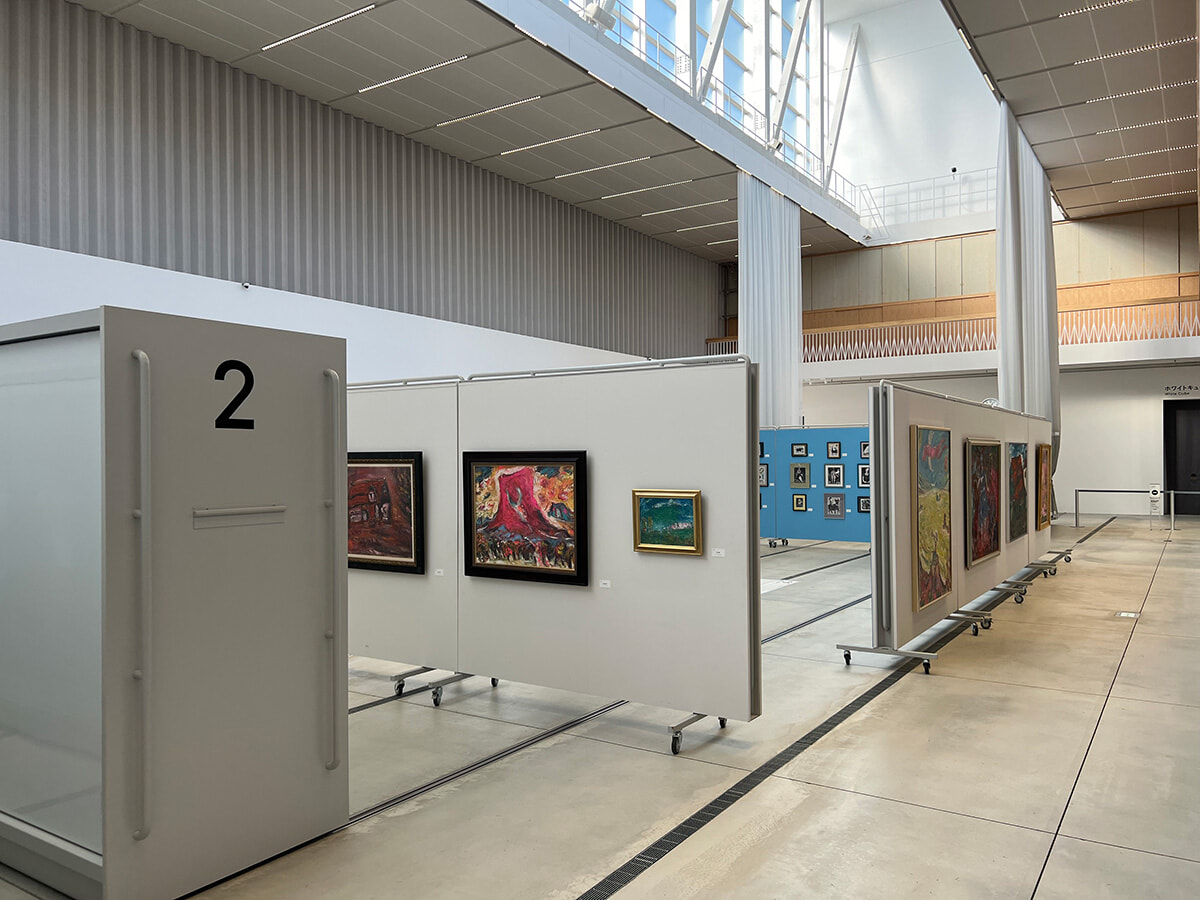 可動式のカーテンや棚が備えられた吹き抜けの「ジャイアントルーム」。漆畑幸男の作品が展示されている。会期中、この体育館のように広いスペースにてさまざまなイベントが行われ、展示内容も変化していく。