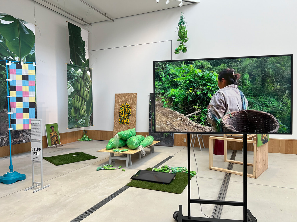 「エンジョイ!アートファーム!!」展示風景より、東方悠平『自由な像、不自由なバナナ』。ベトナムで出合った野生のバナナを新たな文化へと繋がる「扉」、そしてかつての植民地時代のハノイに存在し、現在は八戸の隣町のおいらせ町にある「自由の女神像」(植民地時代のベトナムのハノイにもあったそう)を地域とベトナムを繋ぐ「鍵」として捉え、多様な世界のあり方を可視化するプロジェクトを展開している。なお野生のバナナは種が多く食べられないものの、現地の少数民族がお酒にして飲んでいるという。