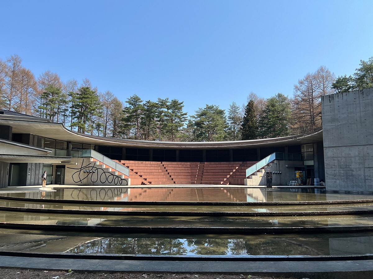 安藤忠雄の設計による青森公立大学 国際芸術センター青森(ACAC)。建物を森に埋没される「見えない建築」をテーマとしている。円形の屋外ステージを備えた馬蹄型の展示棟がユニーク。