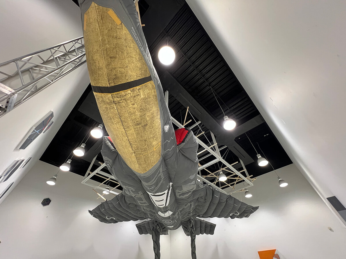 「かさなりとまじわり」展示風景より、青秀祐『Ghost Lightning Kai』(2017/2024年)。航空自衛隊に導入された戦闘機「F35-A ライトニング」を1/1サイズで布地に絵具でペイントしている。
