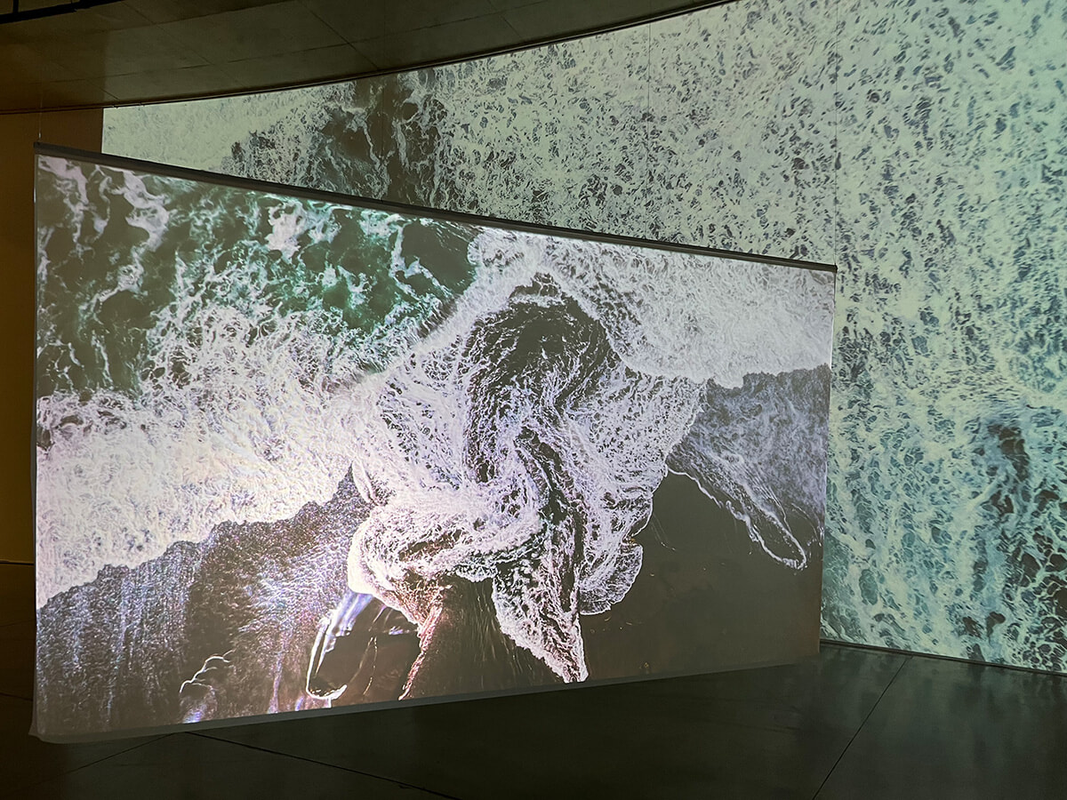 「currents/undercurrents -いま、めくるめく流れは出会って」展示風景より、岩根愛『The Opening』(2024年) 舞台は八戸とほぼ同緯度に位置するカリフォルニア北部ペトロリアのマトール川。川と海がぶつかる様子をドローンで撮影している。