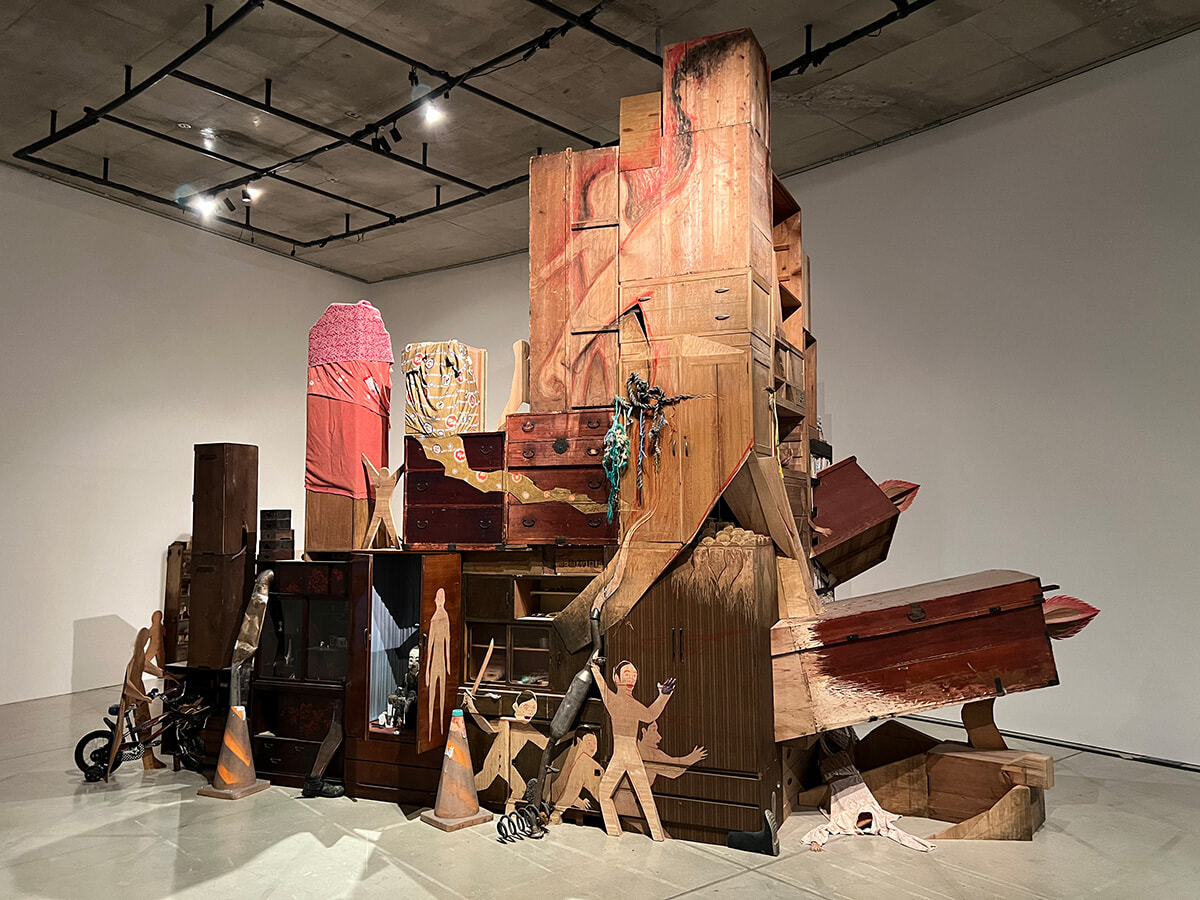 「currents/undercurrents-いま、めくるめく流れは出会って」展示風景より、青野文昭『戦う英雄たち-SACRIFICE 2024』(2024年)今回の制作のために青森市内から箪笥を中心とした不用品を集めた青野。中から出てきた日記帳や古新聞、写真なども作品の素材として利用している。