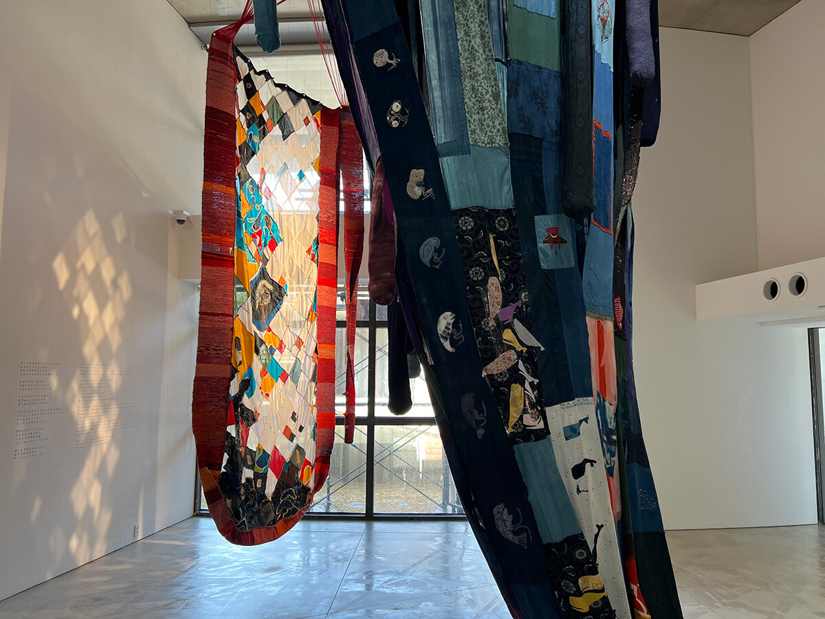 「currents/undercurrents-いま、めくるめく流れは出会って」展示風景より、昰恒さくら『双子鯨の夢を見たら』(2024年)青森県内で集められた着物やハギレを解き、裂いて、重ね、また染め直して作られたテキスタイル。16メートルの鯨の胴体と頭部を象っている。