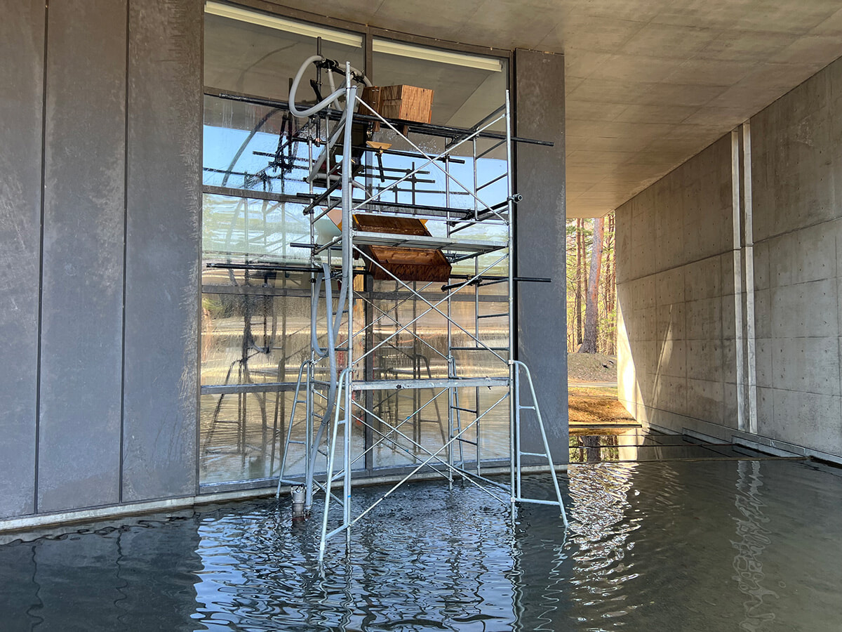 水のテラスでは光岡幸一の可動する巨大な彫刻が物凄い音を轟かせながら水飛沫をあげている。ACACでは野外彫刻が約20点も常時公開中! 森のきれいな空気を感じながら散策し、作品を見て歩くのもおすすめ。