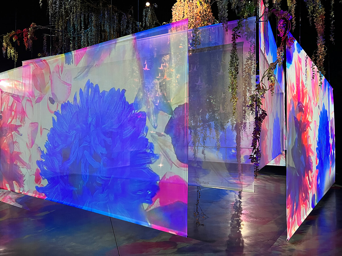 高さ15mの展示室に展開した立体と映像の大型インスタレーション『Sanctuary of Blossoms』は全身で没入したい。咲き誇る花々や枯れてゆく花々がひとつの生命体のように融合した立体を中心に、四季や一日の光の変化などを表現した映像を投影。それがコールタールの塗られた黒い壁へ反映して空間全体をきらめかせている。