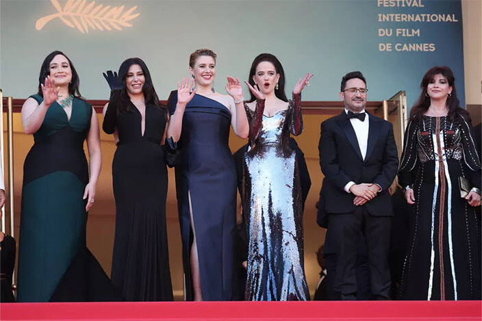 リリー・グラッドストーン、ナディーン・ラバキ、グレタ・ガーウィグ、エヴァ・グリーン、フアン・アントニオ・バヨナ、エブル・セイラン。(カンヌ、2024年5月25日)