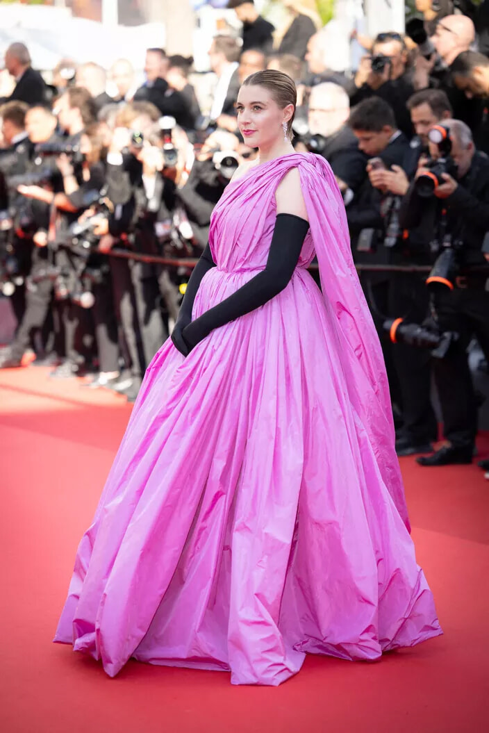 バレンシアガの2022年秋冬オートクチュールドレスに身を包んだグレタ・ガーウィグ。このドレスはリメイクされたもので、元のデザインはもっとボリュームがあり、10番地のジョルジュ・サンク通りのサロンのドアを通り抜けるのが難しいほどだった。(カンヌ、2024年5月23日)