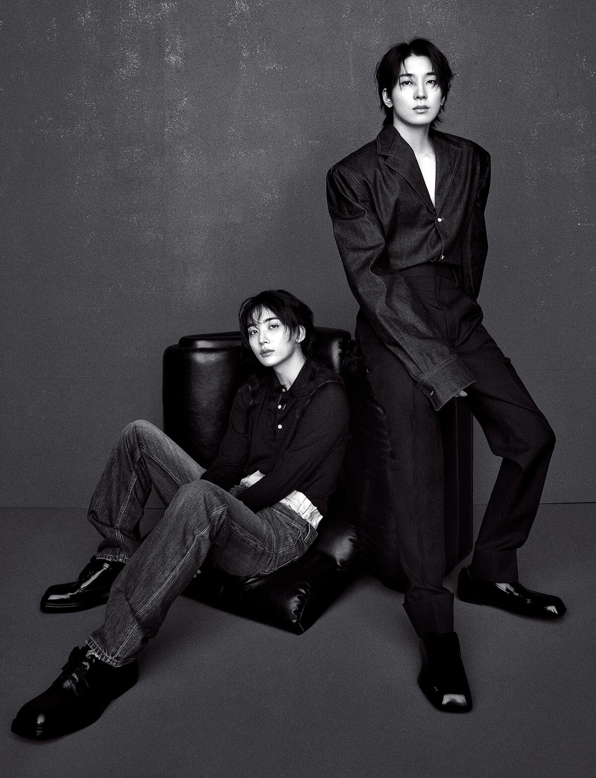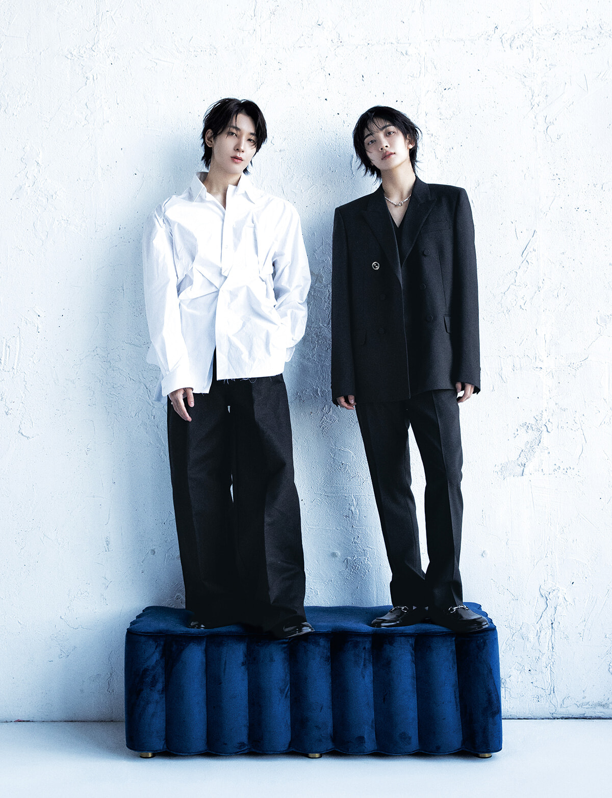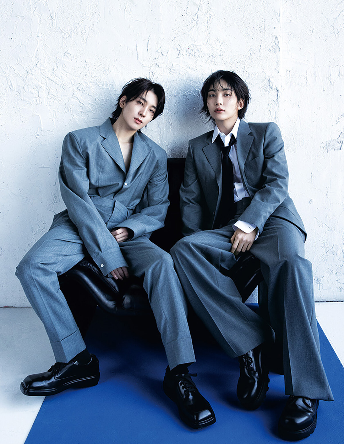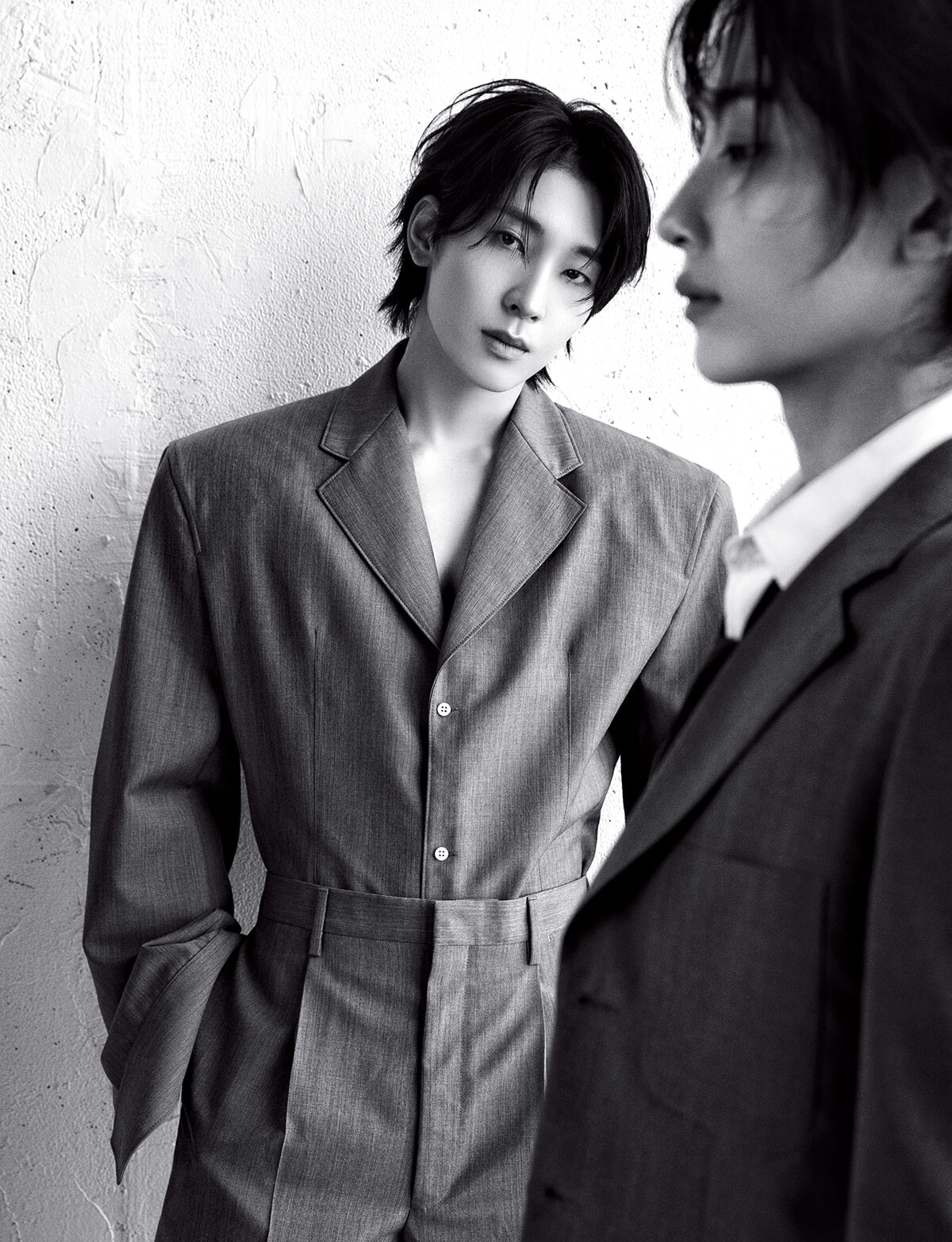 正反対、と互いを評するふたり。 不規則に重なるドレープが印象的な白シャツのWONWOOに対し、ボクシーな黒のテーラードジャケットを羽織ったJEONGHAN。対照的なルックでありながらどこか似た空気が漂うのは、 彼らが同じ歩幅で歩んできたから。