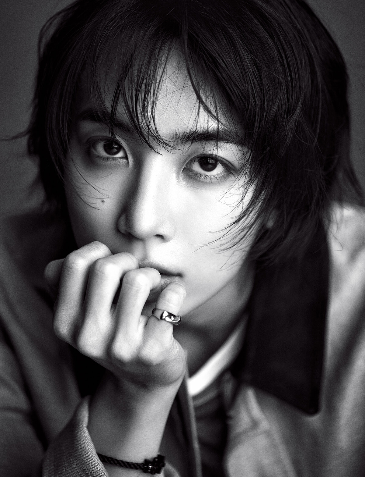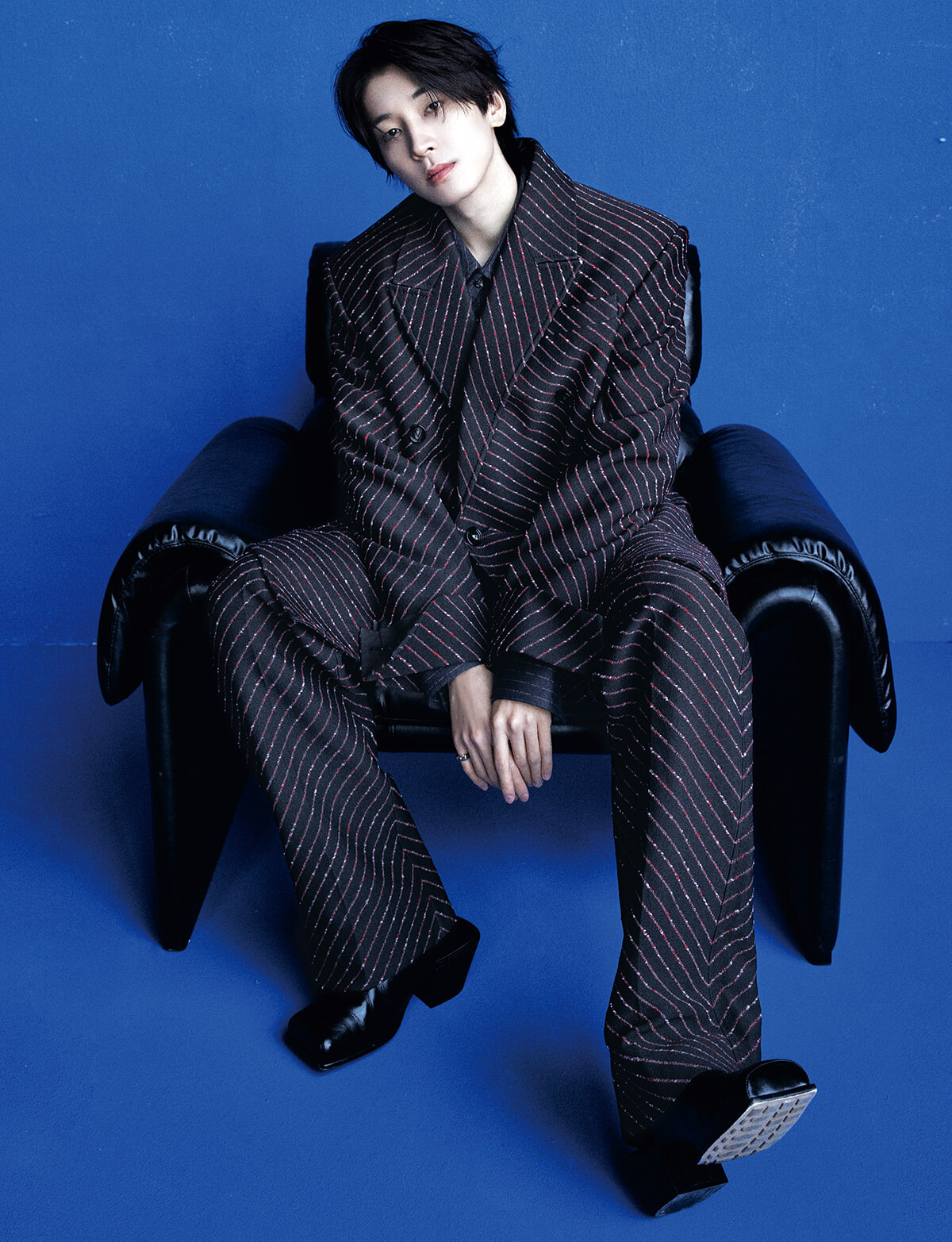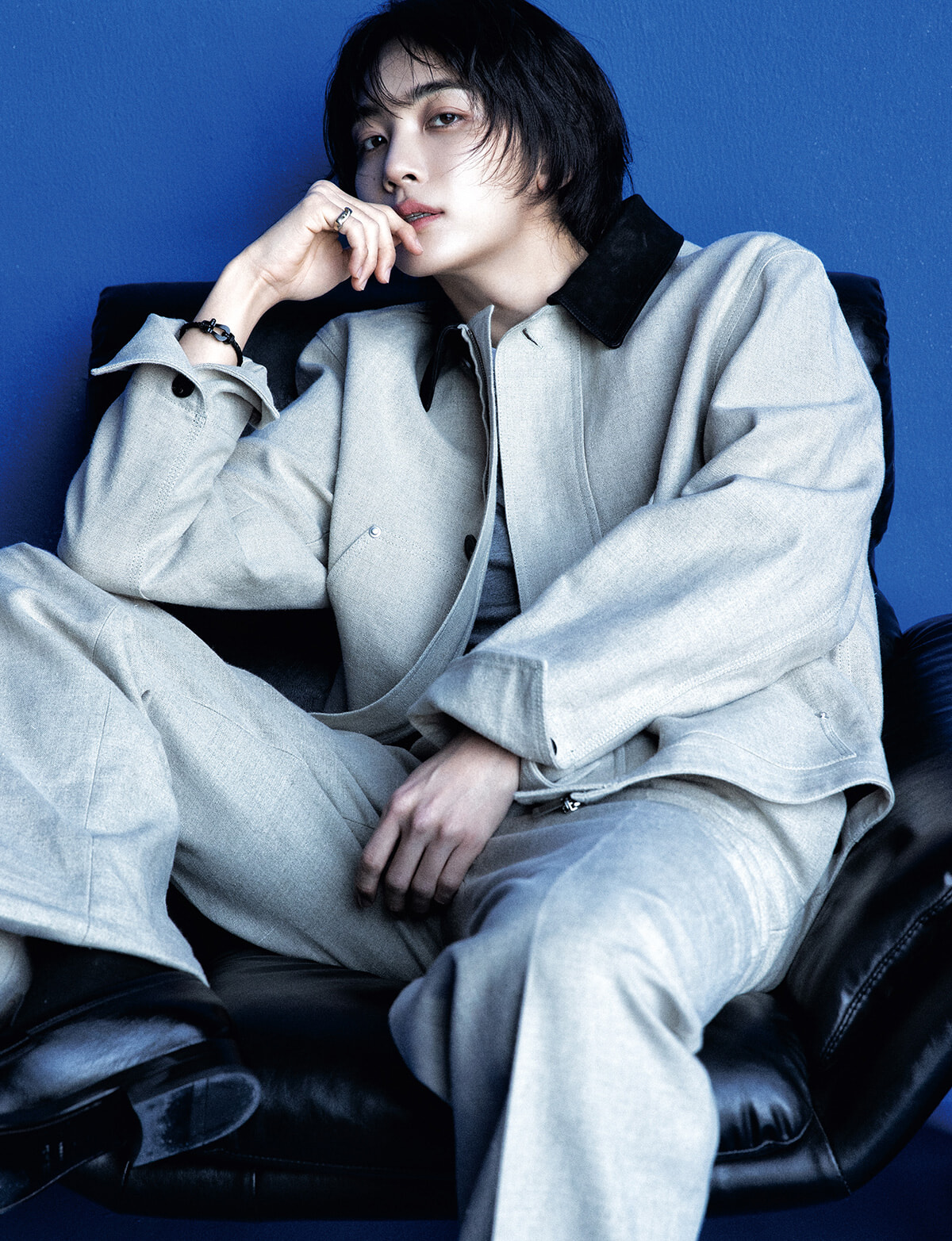 遠くを見つめるまなざしの向こう側には、いつも12人の同志たちがいる。流れるようなシルエットを描くリネンが身体に寄り添い、包容力を漂わせるルック。どんな場面においても柔軟に対応するスマートさを持つJEONGHANの魅力と、品格あるスタイリングがリンクする。