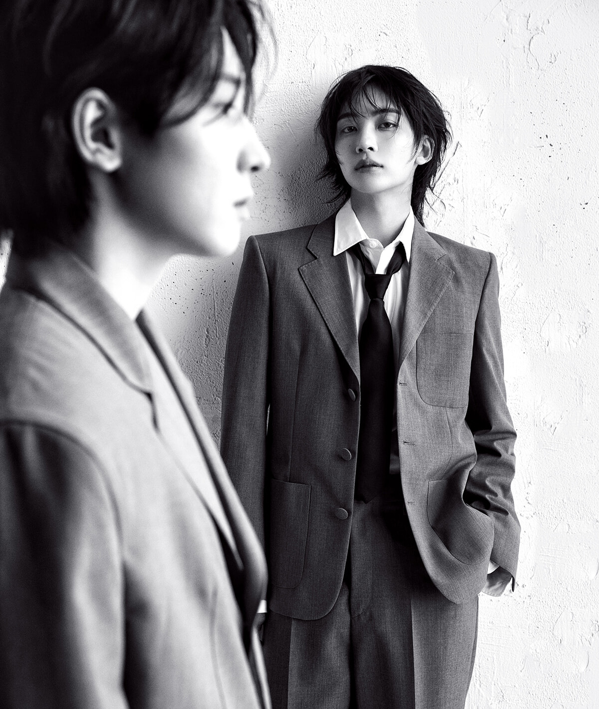 自由なアティチュードで着崩すスーツスタイルが、インティメートかつセンシュアルな存在感を一層際立たせる。