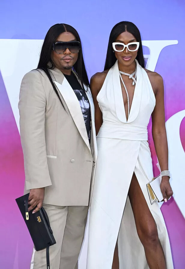 『NAOMI: In Fashion』展のオープニングでポーズをとるロー・ローチとナオミ・キャンベル。(ロンドン、2024年6月19日)