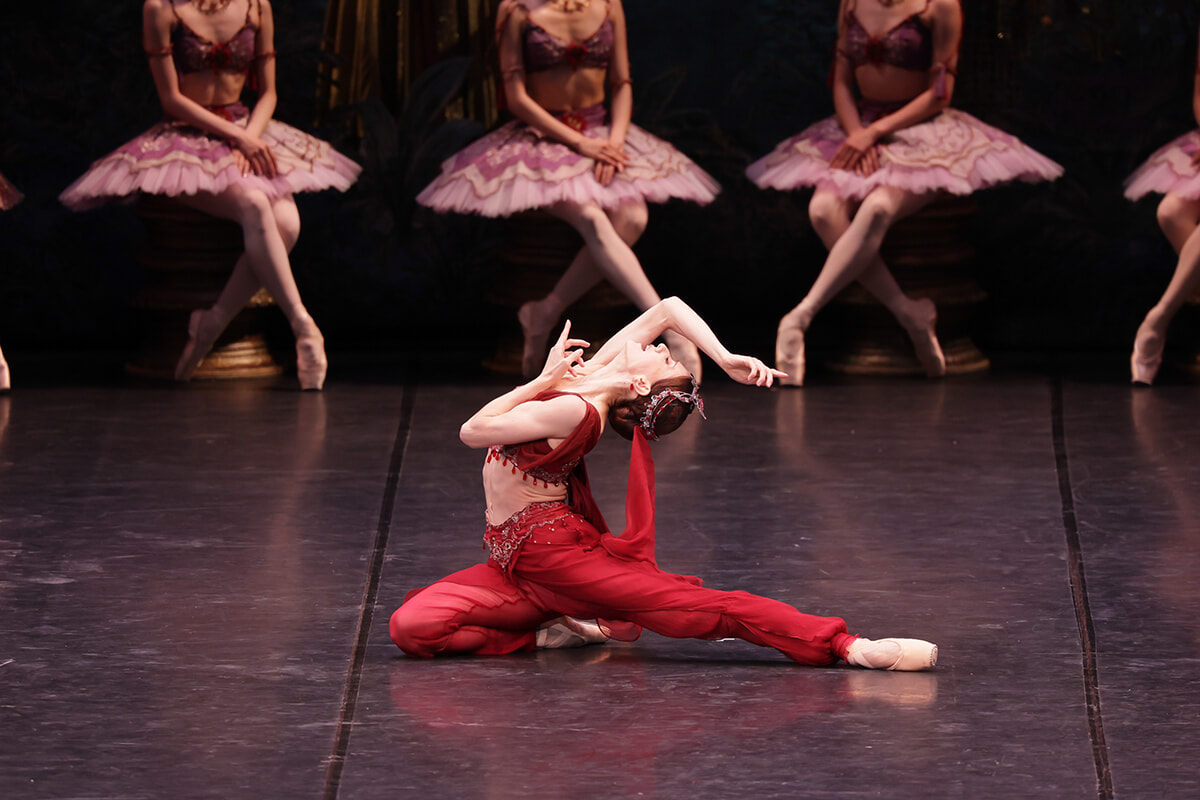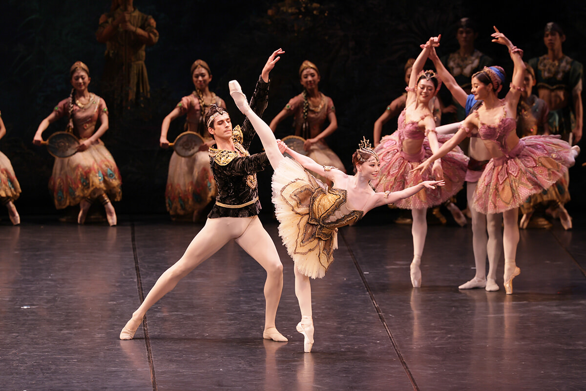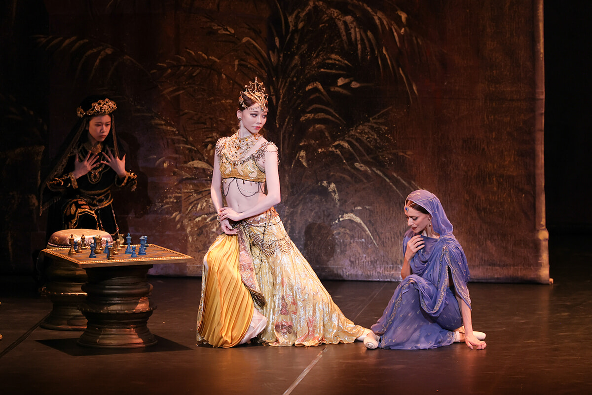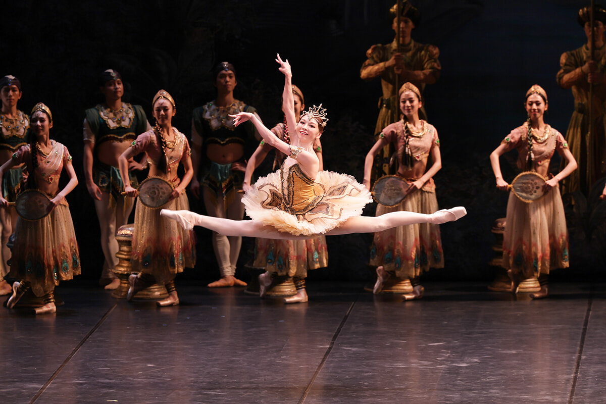 古代インドを舞台に、寺院の舞姫(バヤデール)であるニキヤ(マリアネラ・ヌニェス)と領主の娘ガムザッティ(上野水香)が、戦士ソロルを巡って火花を散らす。