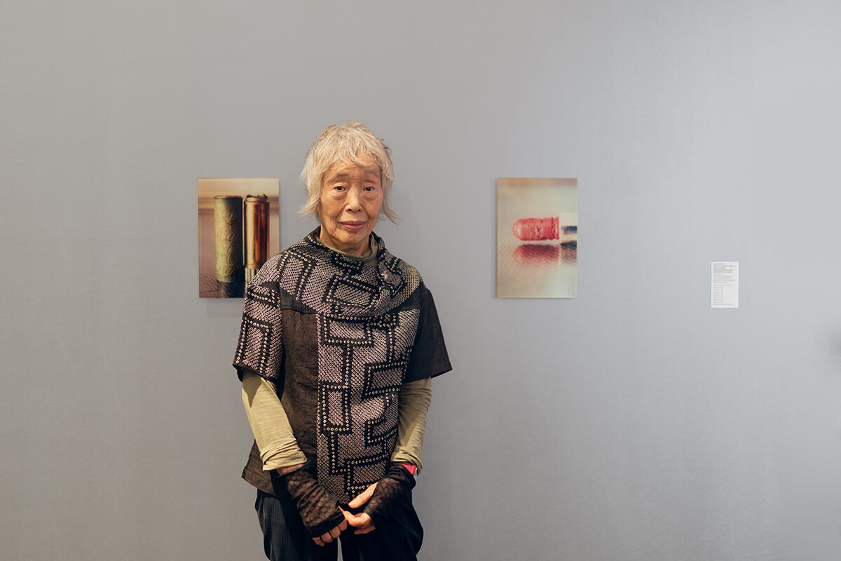 『Belongings』の会場にて、シリーズ『Mother’s』の作品展示の前に立つ石内都。©Marie Rouge