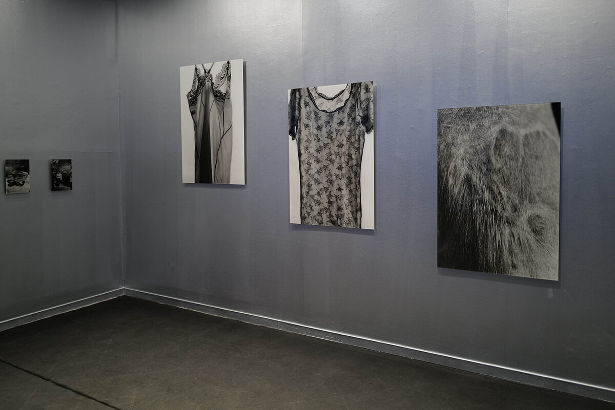 個展『Belongings』より、がんと闘った母の肌を撮影した写真と、遺品となった衣服を撮影したモノクロ写真。©Yusuke Kinaka
