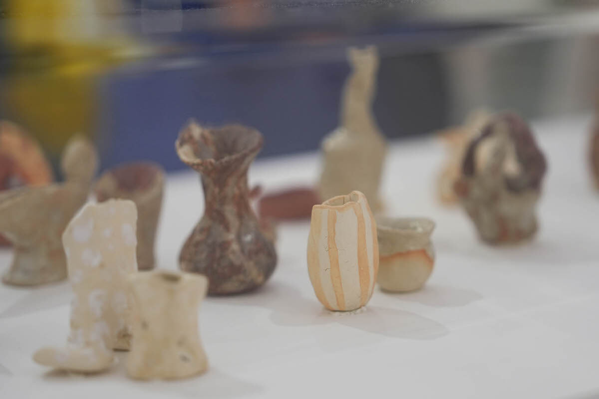 『I’m So Happy You Are Here』より、多和田有希がワークショップ参加者の持参した写真を一枚ずつ焼いた灰を釉薬にして作り上げた、小さな涙壺の展示。©Yusuke Kinaka