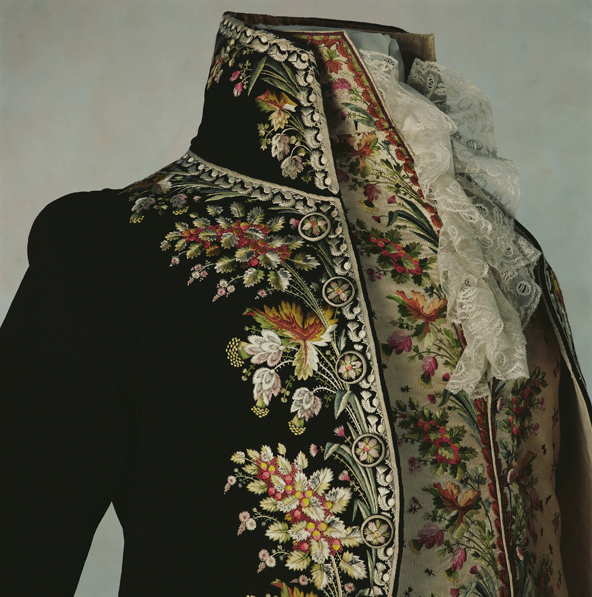 「花の刺繍に覆われた男性の宮廷服を初めて見た瞬間は忘れられない。草花でびっしりと埋め尽くされた上着もベストも、胸元を飾る豪奢なレースも、華美に咲くことを少しも恐れていない。まるで自然の景色のように」(千早)。