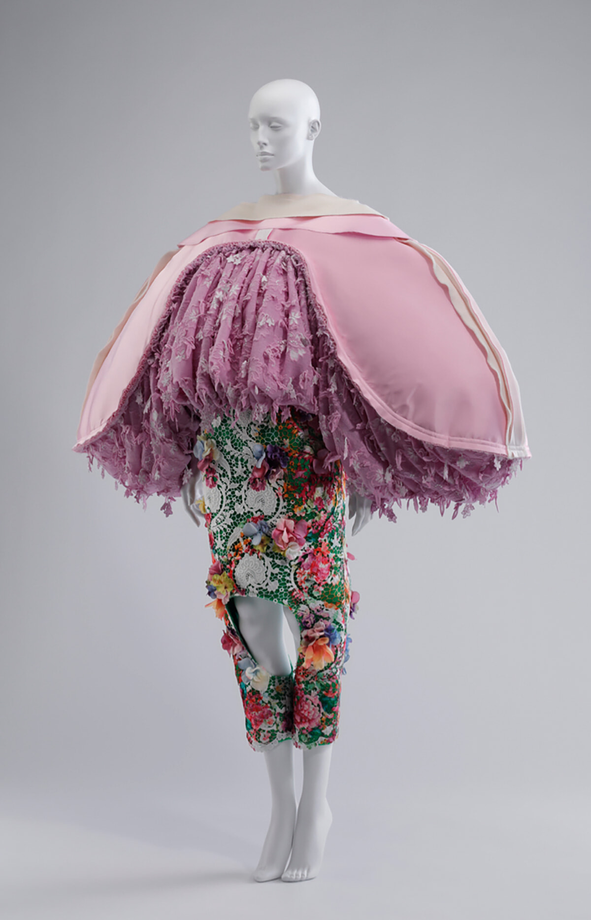 「見たこともないシルエット、なめらかなピンクの繻子の下にふんだんに重ねられた刺繍の織物。服そのものが巨大な植物のようにも、壮大な物語のようにも見える。そして、いまにも羽ばたきそうな変容もはらんでいる」(千早)。
