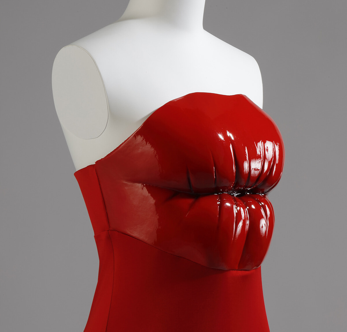 「着る人のそれよりはるかに大きな唇は、血に濡れた臓器のようで、一瞬ぎょっとしてしまった。けれど、ドレスのドレープは優雅で、たおやかに流れる波のようだ。シュールな斬新さと品を併せ持つ、赤い企み」(千早)。
