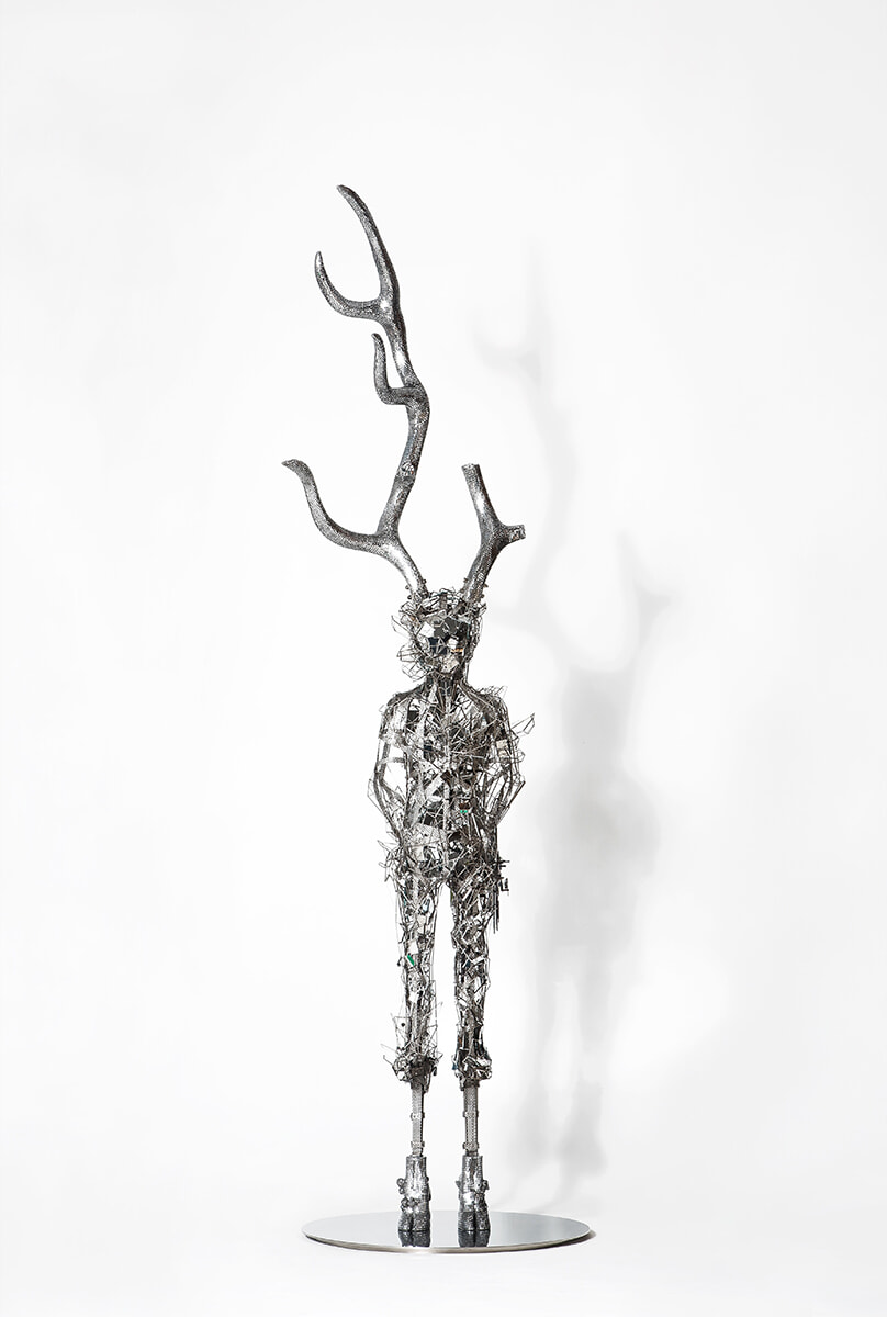 Lee Bul  Titan, 2013  Acier inoxydable, miroir, miroir acrylique, panneau en polyuréthane, perles de verre, tiges en aluminium et acier, fil en nickel-chrome, fibre de verre moulée, peinture acrylique.  290 x 86 x 80 cm   © Lee Bul. Photo : Charles Duprat.    Courtesy Thaddaeus Ropac gallery