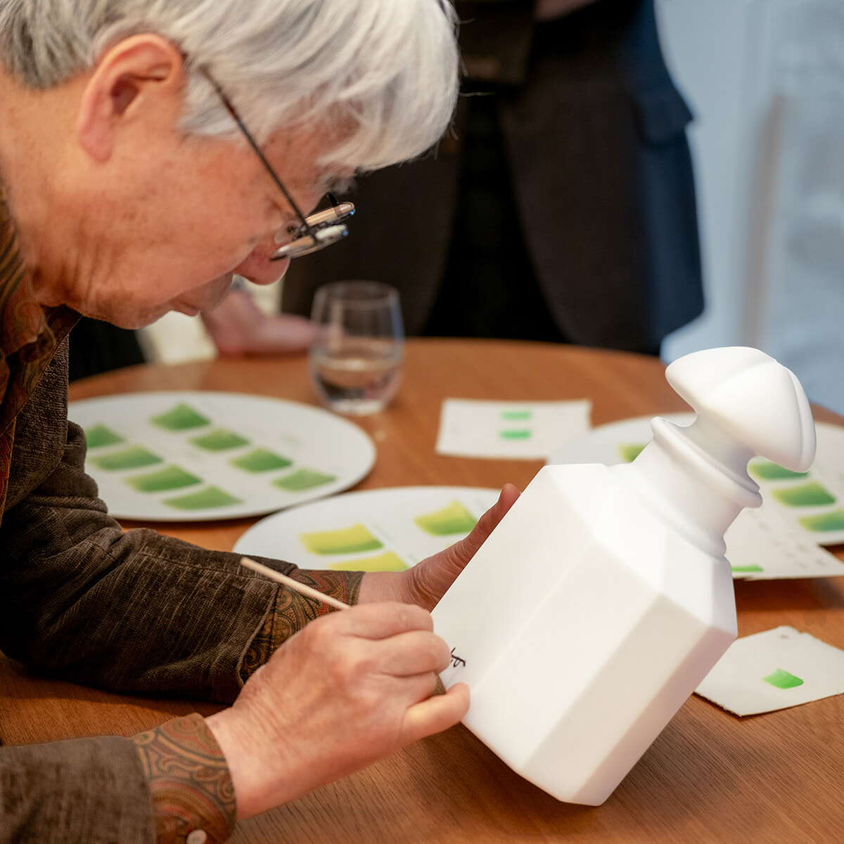 石の触感を思わせる独特の手触りのセラミック製ボトル。白い肌に、自然を象徴するグリーンの筆跡が残されている。リモージュの磁器メゾン、ベルナルドの手仕事が実現したボトルは、一点ごとにリ・ウファンが筆をとってグリーンを施し、自筆のサインを記した。