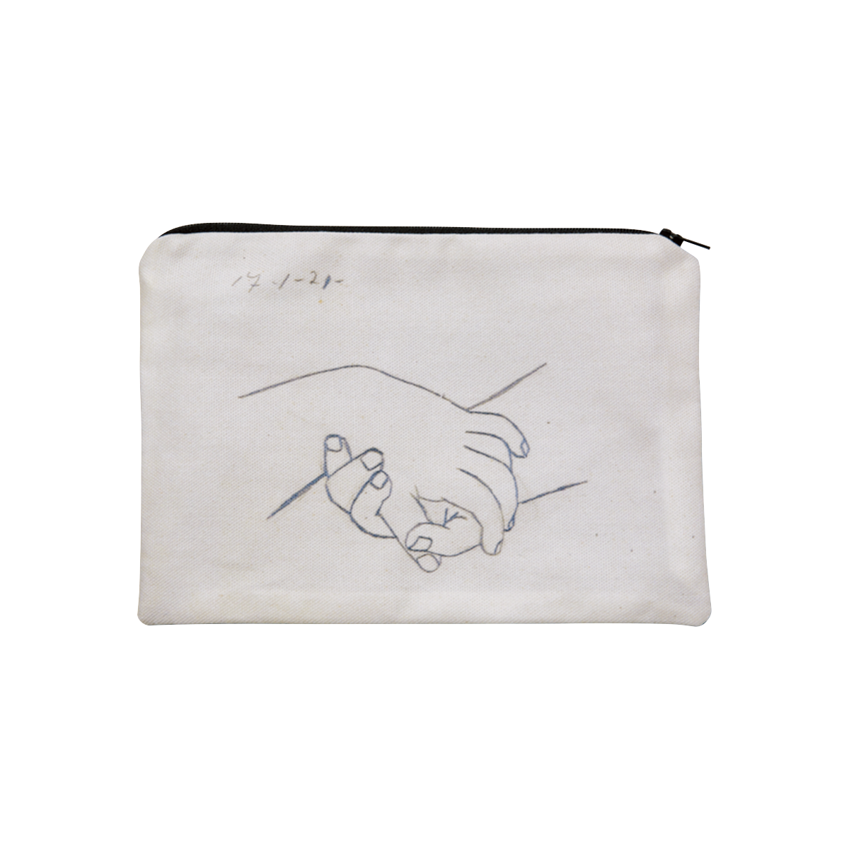 白地のポーチに、ピカソが描いた『組んだ手』のプリントが目を引く。左上の「17-1-21」は、この作品が描かれた1921年1月17日の日付サイン。ドローイングのナチュラルなラインが洗練された雰囲気。