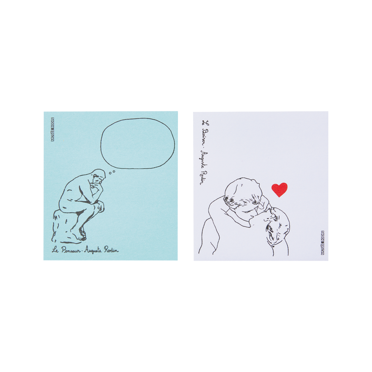 『接吻』や『考える人』が描かれた付箋シリーズ。ハートマークや吹き出しなど、ロダンの彫刻作品に添えられたイラストが愛らしい。白、水色、黄色、緑など、カラーバリエーションも豊富。デスクに一冊置いておきたい。