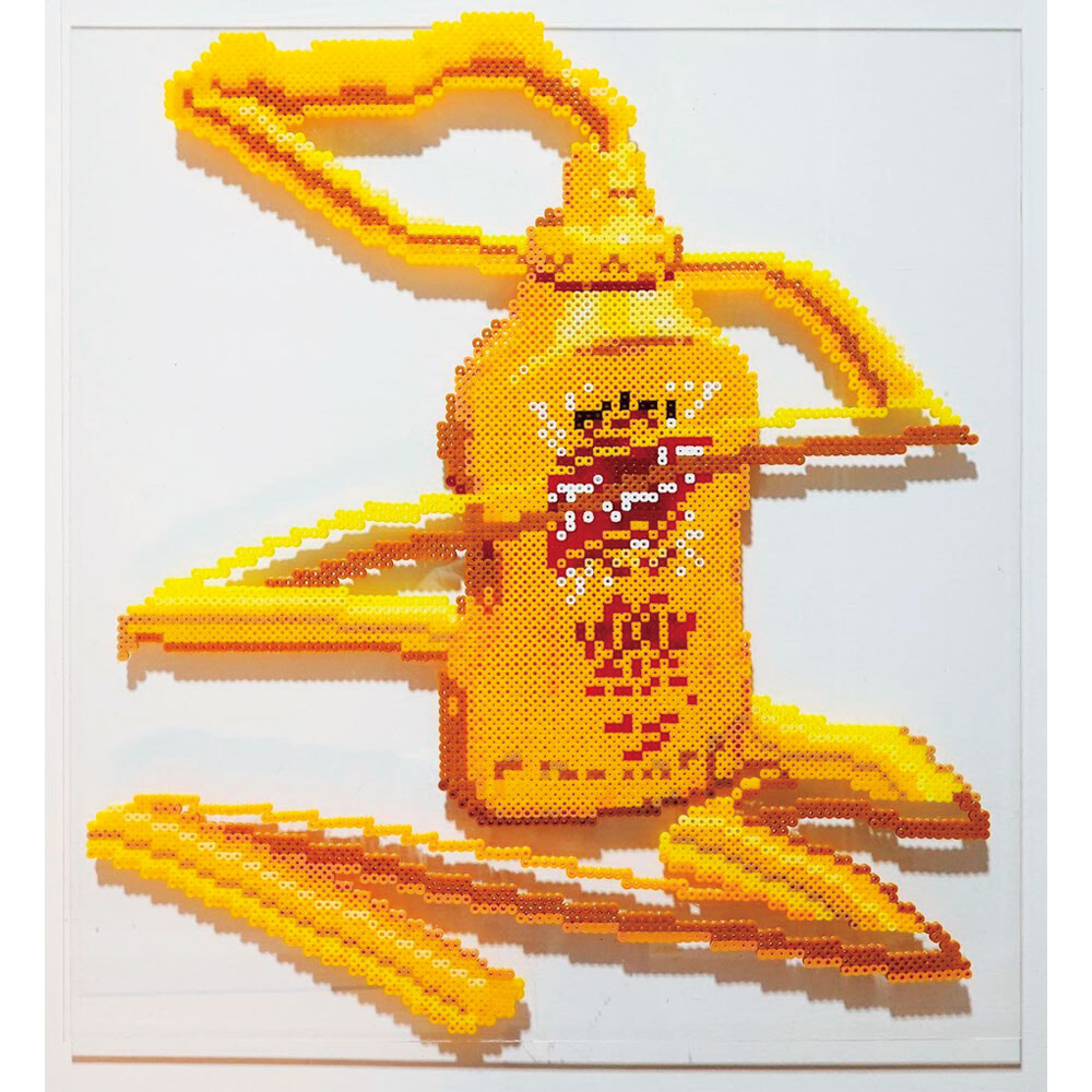 デジタルネイティブ世代に生まれた彼女は、PC上のバグやグリッチなど、モニター上で起こる映像の乱れをテーマにピクセルアート作品を制作。素材にはアイロンビーズを使用し、ダイナミックな色使いと立体感が魅力。