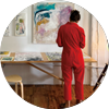 ニューヨークでアーティスト、料理家、デザイナーと多方面で活動。鉛筆やアクリル絵の具、オイルスティックを使い、大胆な色彩のレイヤーを作り出すとともに躍動感ある力強い筆使いで抽象画をエネルギッシュに描く。