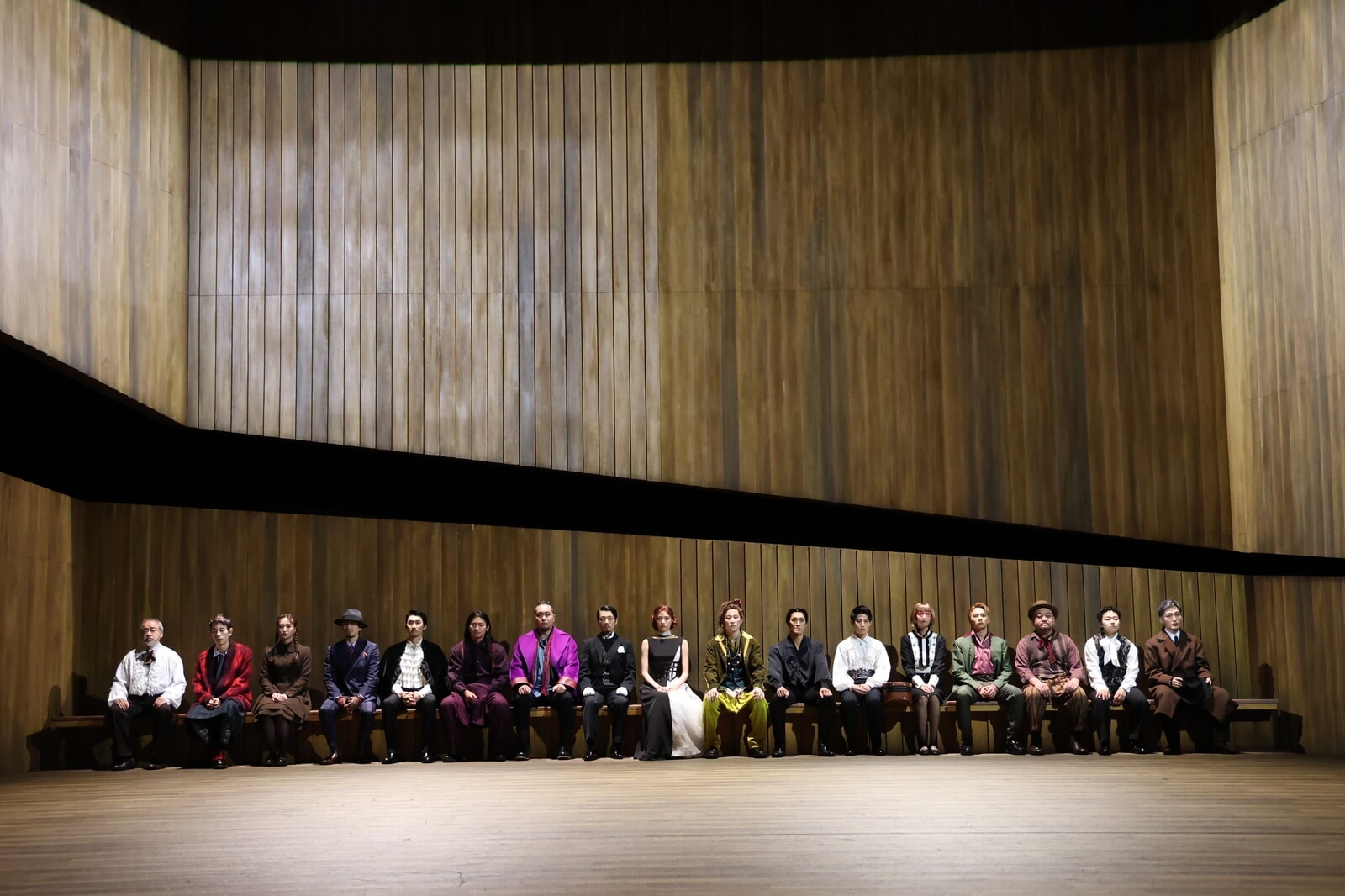 舞台を囲むのは、巨大な斧、あるいは鉈で真っ二つにされたような亀裂のある壁。そこはかとなく不穏な空気が滲み出てくるようだ。定刻になると、下手から17人の出演者全員が登場、舞台奥のベンチにずらりと一列で着席。現代の衣裳をまとった彼らは、そこで物語の成り行きを傍観、衣裳を替えに袖に入ることもなく、ひたすら劇空間の中で物語に立ち会うのは、体力的にも厳しいだろう。女性キャストで演じる『ジュリアス・シーザー』をはじめ、革新的な手法で多くの観客を魅了する森ならではのシェイクスピアに、すっかり心を掴まれてしまう。