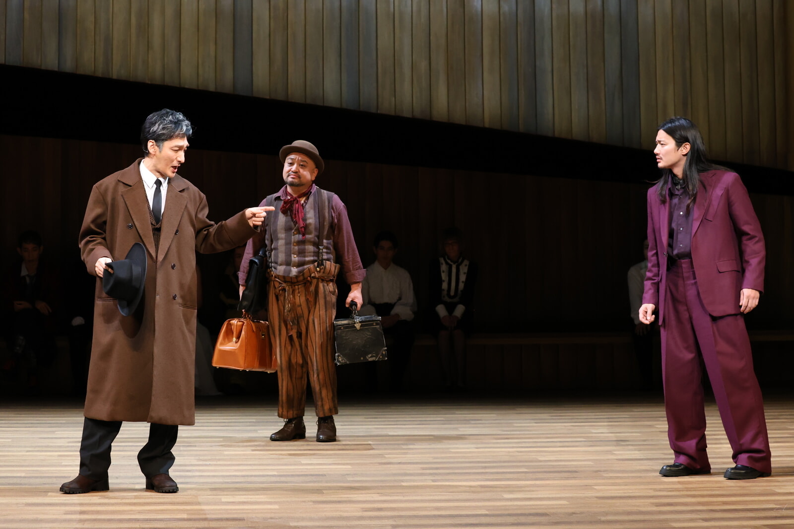 「どうしてこんなに気が滅入るのか」と口火を切るのは、タイトルロールのヴェニスの商人、アントーニオ。演じる忍成修吾は、チェックのスーツにハット、レザーの手袋の勝ち組風情が印象的だ。彼の親友バサーニオ(野村周平)は、父親の莫大な遺産を手にした富豪の娘、ポーシャ(佐久間由衣)に求婚したい。アントーニオはそのための資金を用意すると約束する。ふたりの絆も、本作の需要な要素のひとつだ。が、アントーニオの財産はすべて海上の船の中。そこで思いついたのが、高利貸しのシャイロックに金を借りることだった。