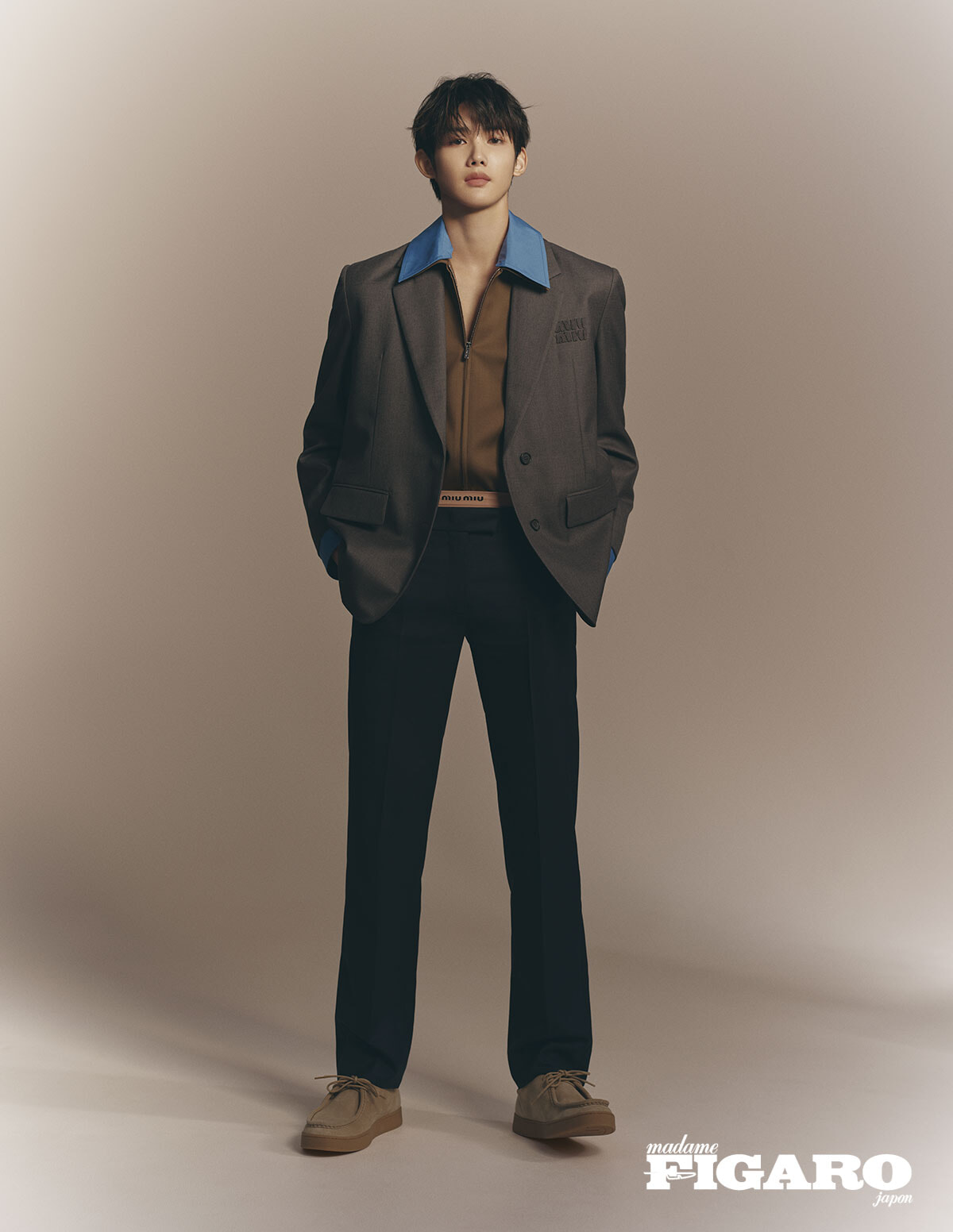 ジャケット¥594,000、中に着たブルゾン¥500,500、パンツ¥231,000、アンダーウエア¥42,000(すべて予定価格)/以上ミュウミュウ(ミュウミュウ クライアントサービス) シューズ¥141,900(予定価格)/チャーチ(チャーチ クライアントサービス)