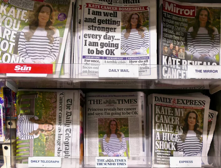 イギリスのメディアや公人たちがすぐに反応した。バッキンガム宮殿から発表された声明の中で、国王チャールズ3世は義理の娘であるキャサリン皇太子妃を「誇りに思う」と述べた。その日の夕方、エマニュエル・マクロン仏大統領、当時のリシ・スナク英首相、チャールズ3世に続き、ハリー王子とメーガン・マークル夫妻もキャサリン皇太子妃への支援の意を表明した。