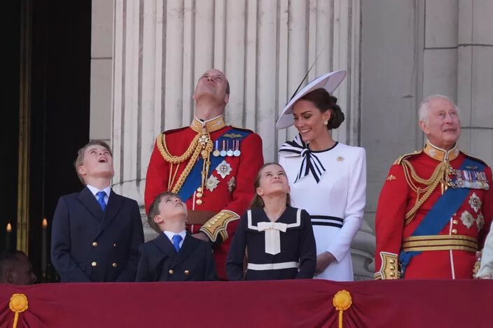 バッキンガム宮殿のバルコニーでは、ウィリアム皇太子とキャサリン皇太子妃の仲睦まじい様子が写真家たちの目を引いた。(ロンドン、2024年6月15日)