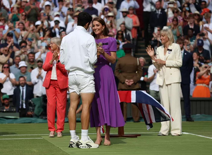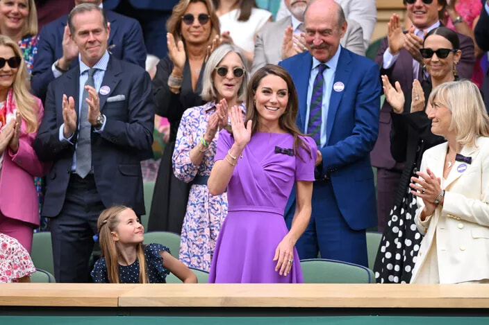 1ヶ月後の7月14日(日)、キャサリン皇太子妃はウィンブルドンのテニス大会に姿を現し、男子決勝を観戦した。ウィンブルドンのセンターコートに到着すると、キャサリン皇太子妃は観客からスタンディングオベーションで迎えられた。テニス愛好者である彼女は、その後、トーナメントの優勝者であるスペインのカルロス・アルカラスにトロフィーを授与した。この試合ではセルビアのノバク・ジョコビッチと対戦していた。