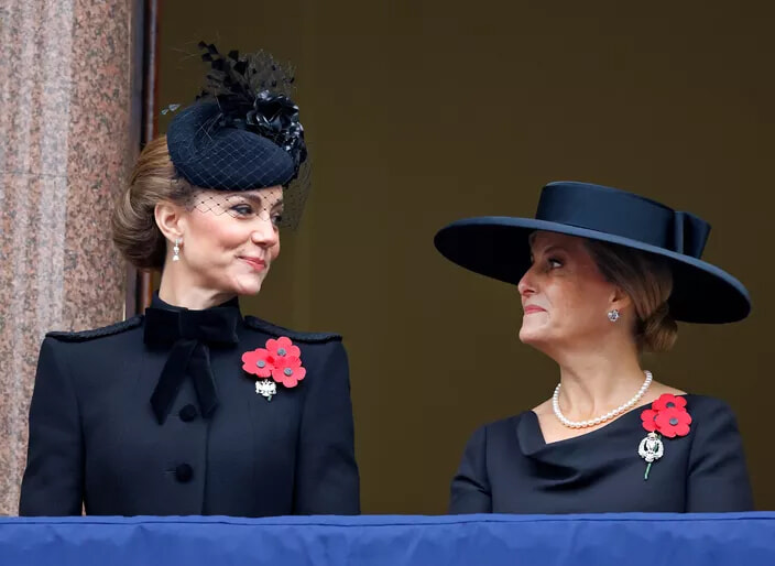 戦没者の日(「リメンブランス・デー」)に、キャサリン皇太子妃がウィンザー家とともに戻ってきた。ここでは、ロンドンのセノタフの上にあるホワイトホールのバルコニーで、エディンバラ公妃ソフィー妃と一緒に立っている。(ロンドン、2024年11月10日)