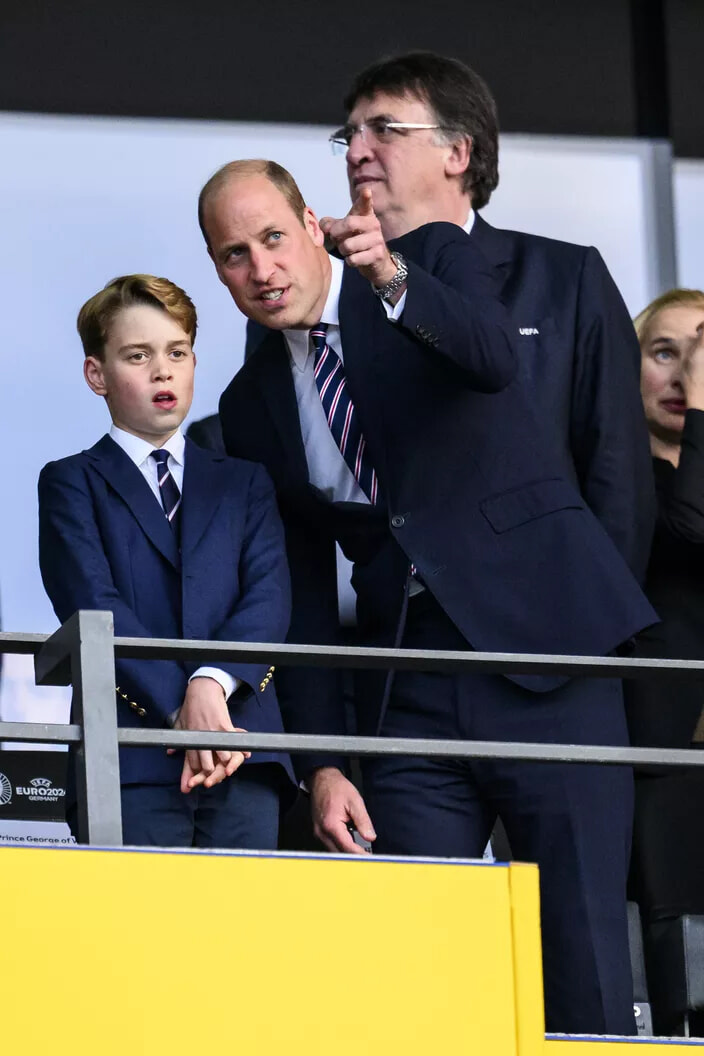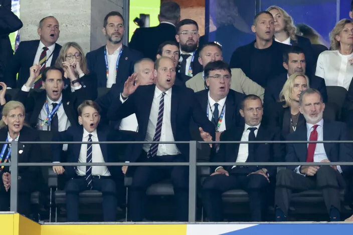 サッカーのユーロ2024決勝戦、イングランド対スペイン戦に臨むジョージ王子と父ウィリアム皇太子。(ベルリン、2024年7月14日)