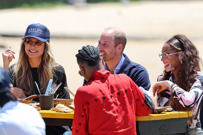 アースショット・ウィークの一環として、ウィリアム皇太子はハイディ・クルムやウィニー・ハーロウとともに、カルク・ベイの漁師たちと伝統的な魚料理の昼食会に参加した。(ケープタウン、2024年11月7日)