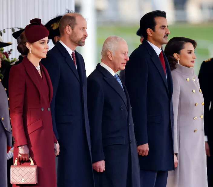 カタール首長タミーム・ビン・ハマド・アール=サーニーの国賓訪問に夫婦で出席するキャサリン皇太子妃とウィリアム皇太子。(ロンドン、2024年12月3日)