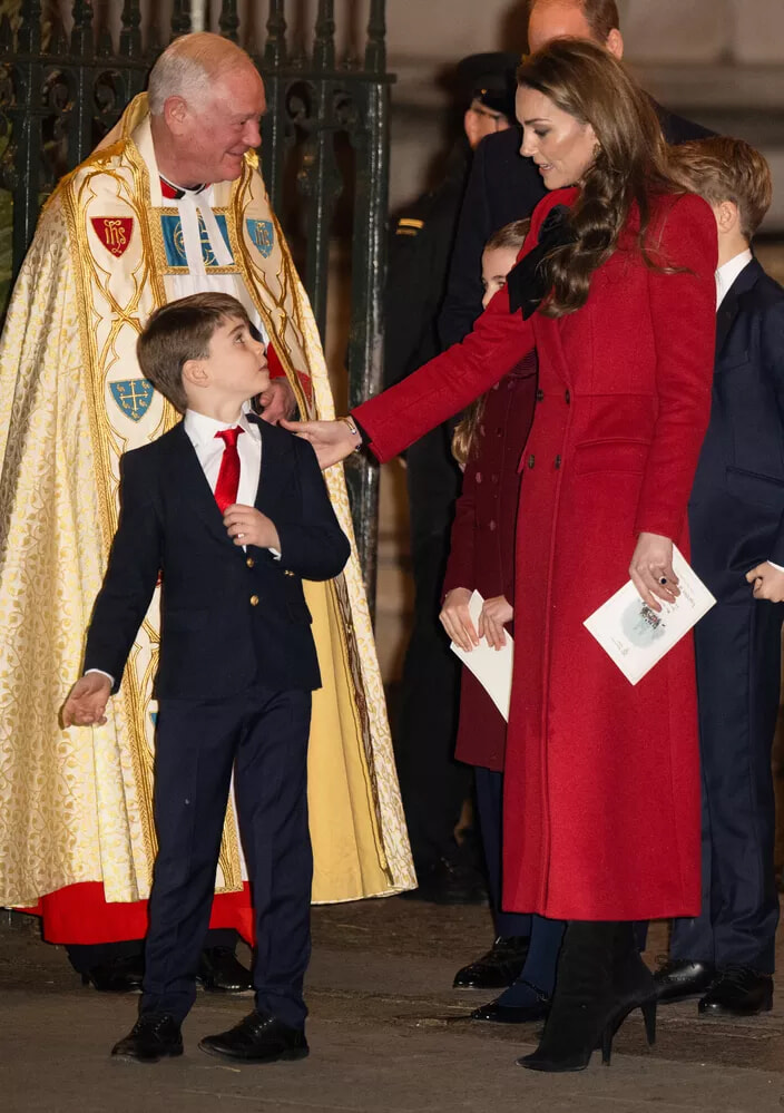 真っ赤なコートに大きな黒いリボンを締めたキャサリン皇太子妃は、約1600人の招待客とカメラマンの前に堂々と登場した。アレキサンダー・マックイーンの衣装にラルフ ローレンのブーツを合わせた。(ロンドン、2024年12月3日)