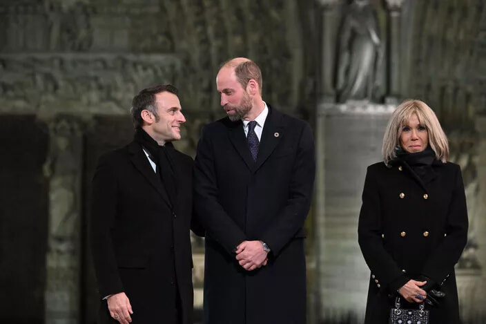 ウィリアム皇太子はパリのノートルダム大聖堂の再開式に出席したゲストのひとり。前庭でエマニュエル・マクロン、ブリジット・マクロン夫妻とポーズをとった。(パリ、2024年12月7日)