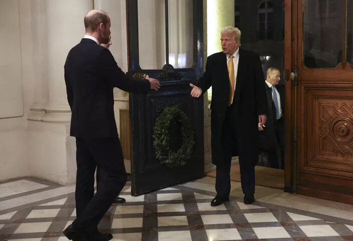 2024年12月7日、ウィリアム皇太子はパリのノートルダム大聖堂再開式の後、アメリカ合衆国の大統領選に当選したドナルド・トランプと約40分間会談した。(パリ、2024年12月7日)