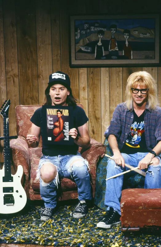 「サタデー・ナイト・ライブ」で雑誌を手にしている映画『ウェインズ・ワールド』のデュオ、マイク・マイヤーズとダナ・カーヴィー。photography: NBC / NBCUniversal via Getty Images