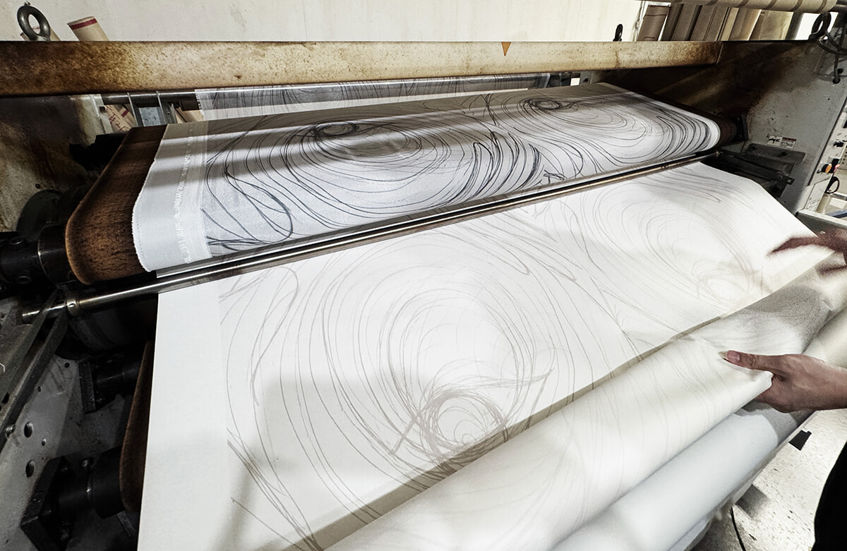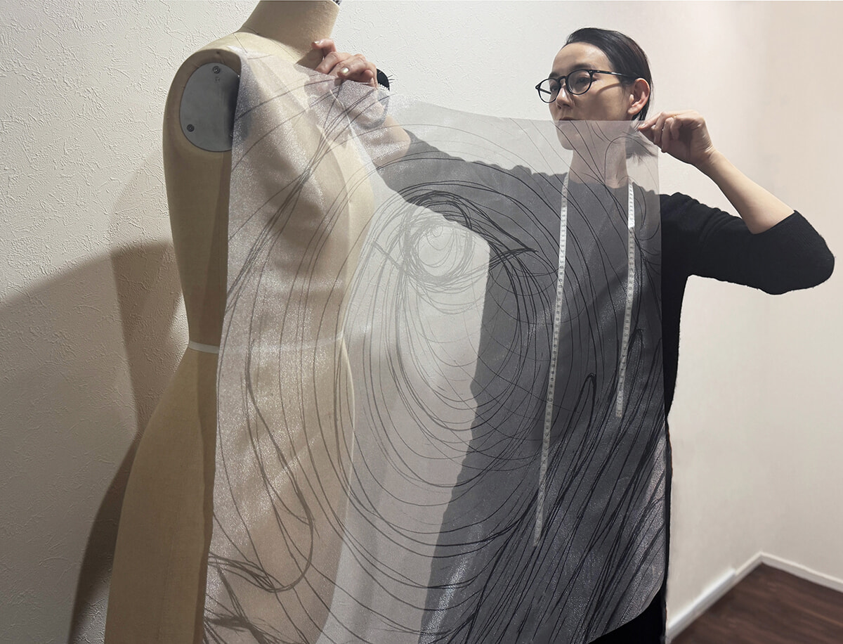 透け感のある生地は2020年「SHIKAKU」展でも創作を共にさせていただいているogawamine LABで展開しました。昇華転写プリントという水の使用量を抑えることができる印刷で仕上げています。
