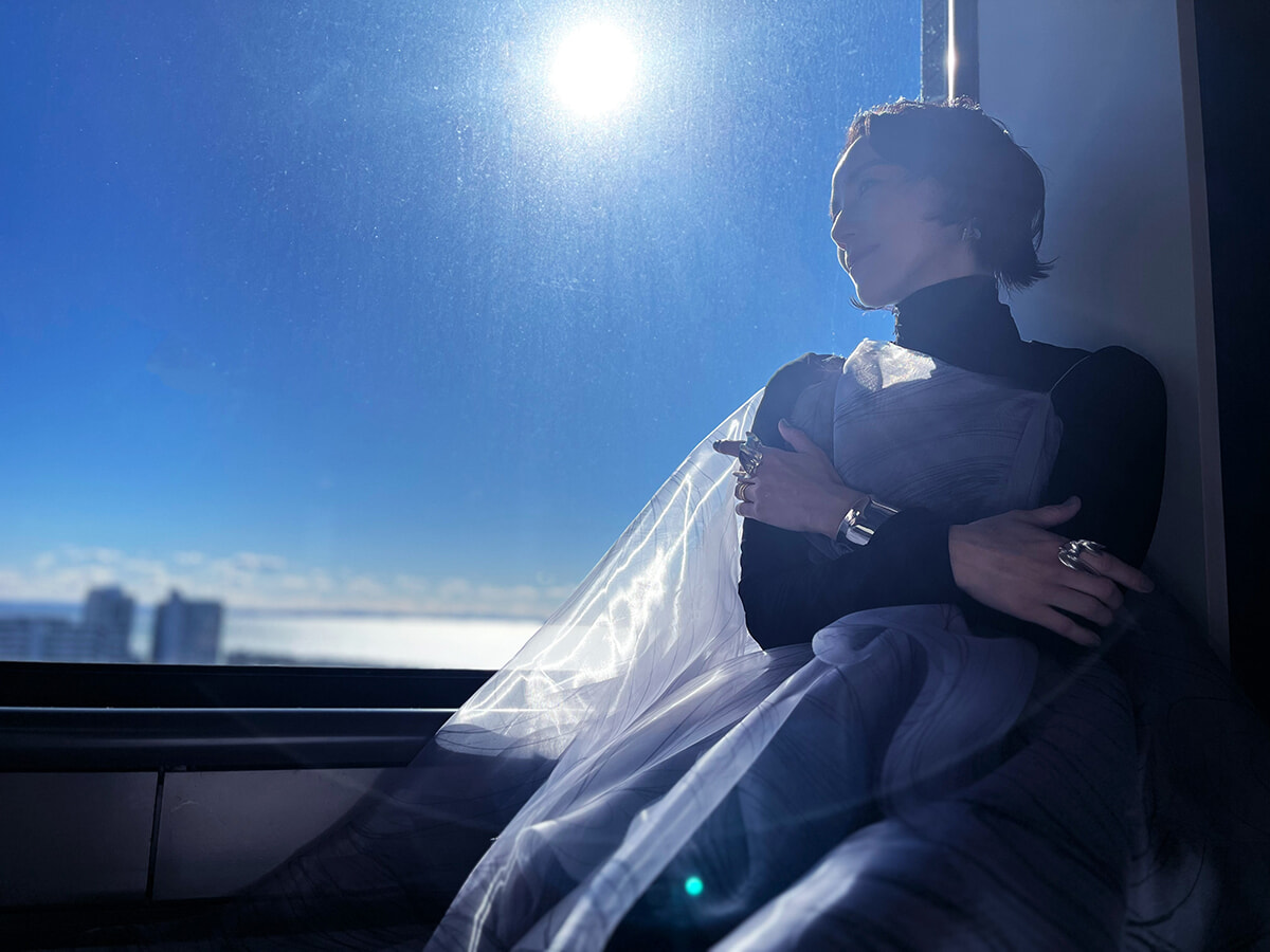 纏った素材は空間に合わせた透明感のあるシルクオーガンジーをレイヤードしたデザイン。篠原ともえ公式インスタグラムではそのプロセスを動画でも公開していますので、是非ご覧ください。