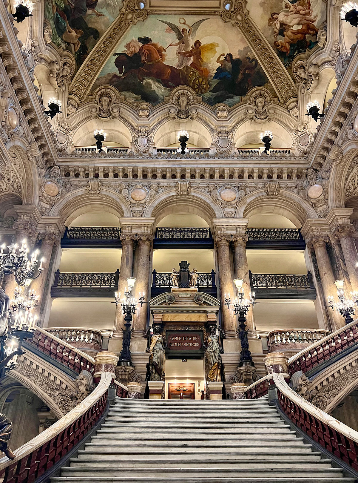 「私たちは毎日裏手のアーティスト用入口から入るじゃないですか。でも、ときどき反対側の表に回って公演を観ることがあって、あの大階段を上がりながら下から見上げる時に目に飛び込んでくるあの雰囲気。あああ、すごーいって。そして大階段を上がり、観客席の中に入ってシャガールの天井画を見て、またわーっとなりますね。150年も前に建築された劇場で踊るっていうのは、ニュージーランドでは考えられないことです。ステージに立っている時、ガルニエはこぢんまりとしていて観客席が近いからか、雰囲気が”熱い”という感じがあります。逆にバスティーユでは観客が遠くにいる、という感じ……それはそれで好きです。バスティーユの舞台で踊るって、あの大きさが気持ちいいんですね」