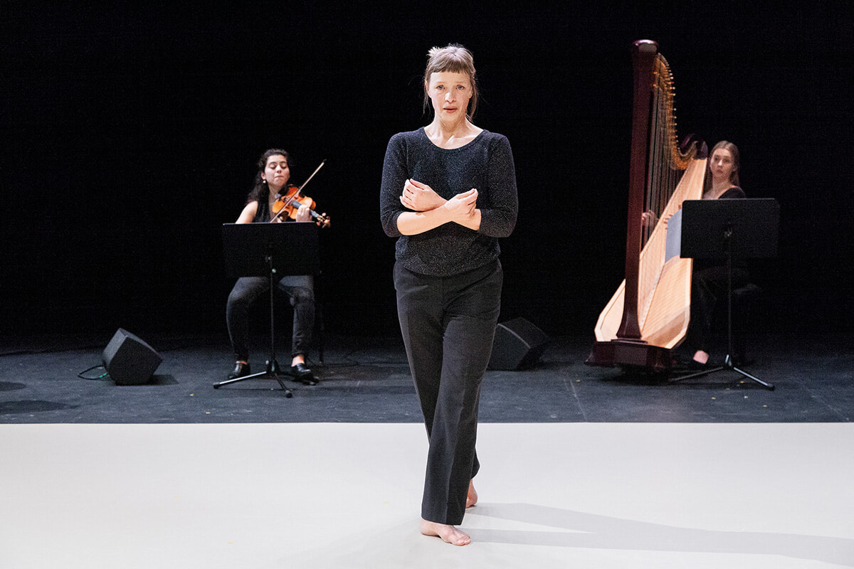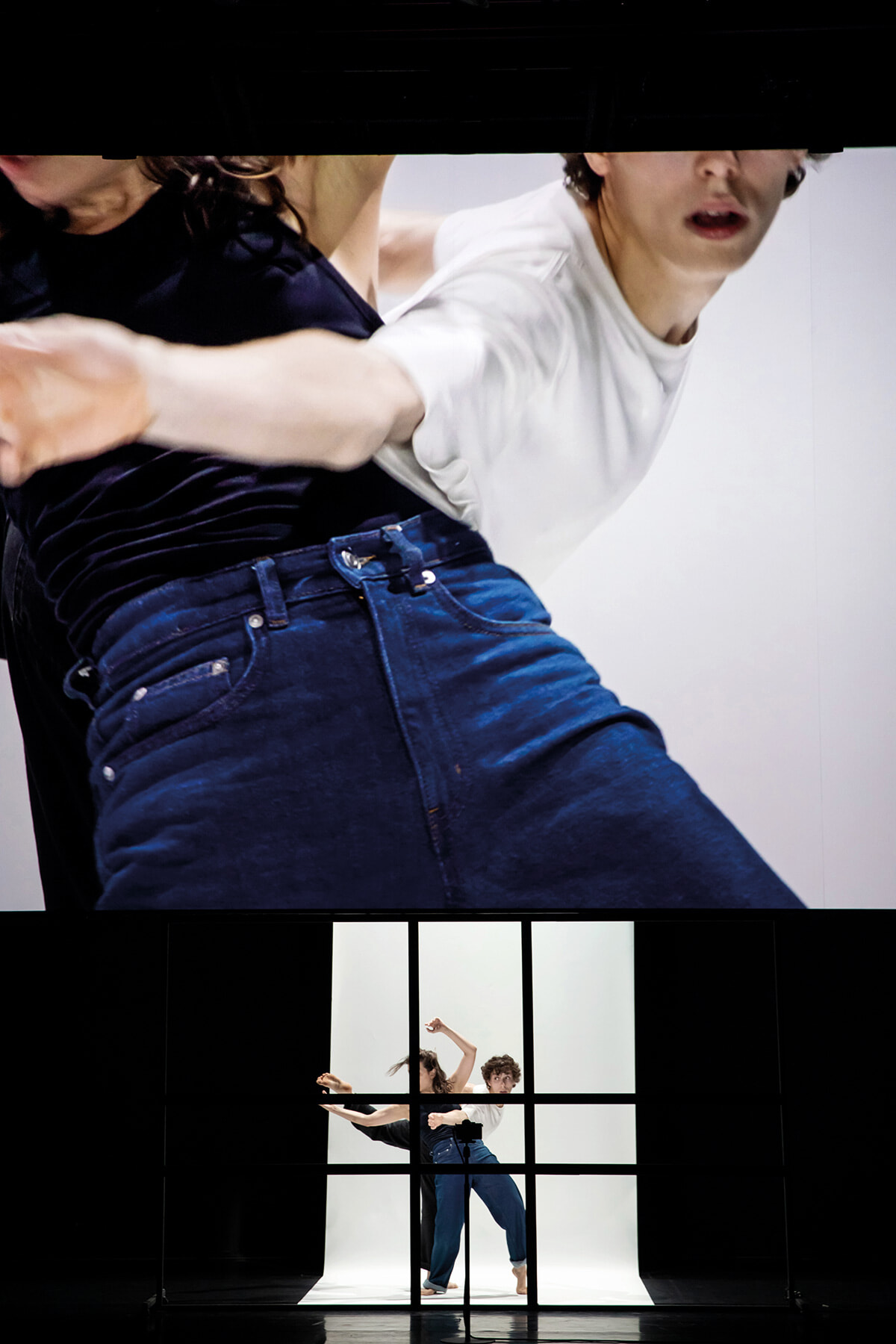 『Close Up』:バッハの「フーガの技法」「無伴奏ヴァイオリン・ソナタ第2番」をアンサンブルが演奏する傍らで、6人のダンサーのオーガニックなムーヴメントが流れるように展開するノエ・スーリエの振付。リアルタイムの映像の使用によって舞台空間に実像と虚像が並置され、ふたつの時空の探究が行われる。© Van Cleef & Arpels SA – 2024 – Delphine Perrin