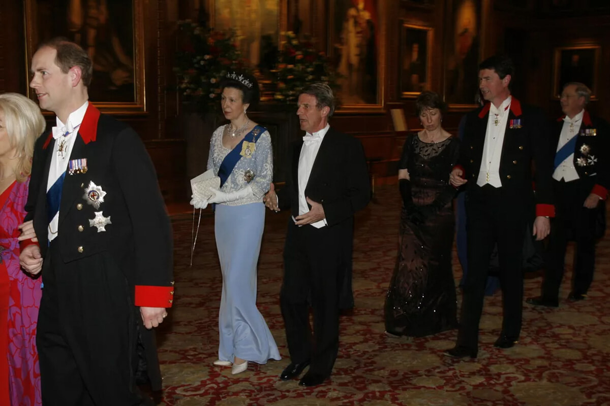 ウィンザー城で開催されたニコラ・サルコジ仏大統領と大統領夫人のカーラ・ブルーニを迎える公式晩餐会にデビッド・サスーンの青いドレスで出席したアン王女。(ウィンザー、2008年3月26日)photography: Pool Interagences / Gamma-Rapho via Getty Images