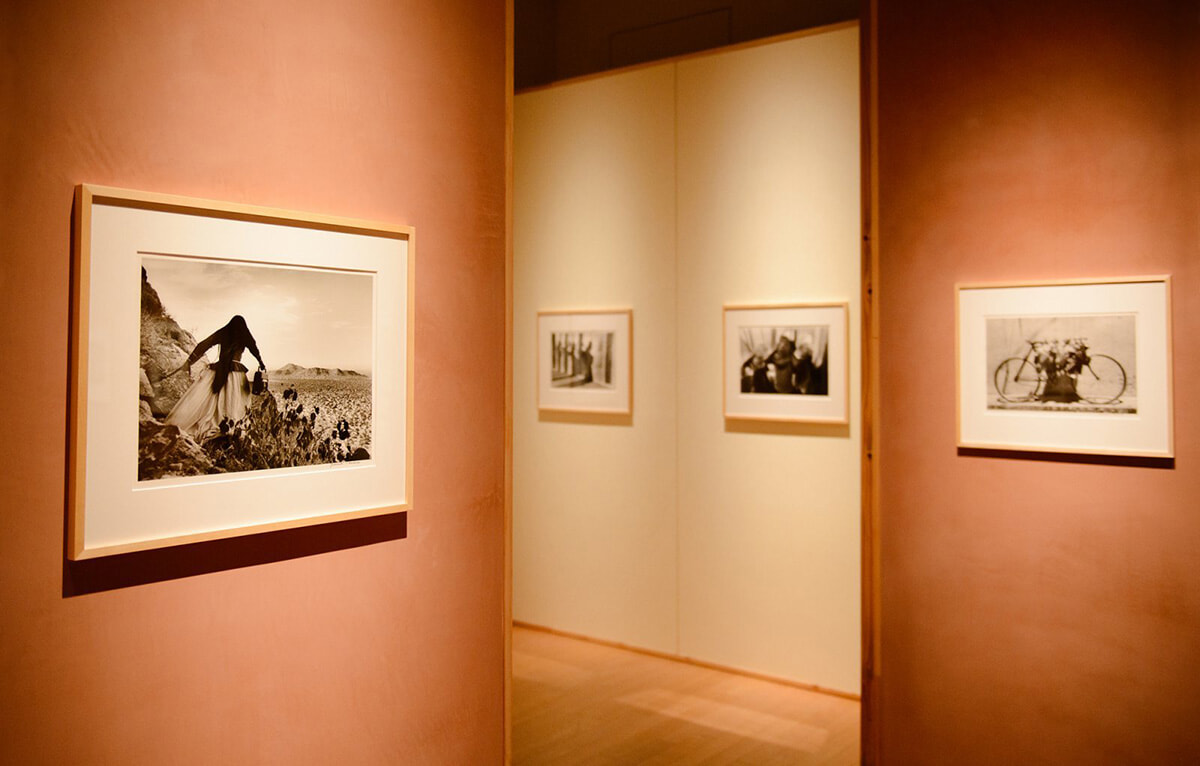 世界の色彩を目で受け止めながらも、彼女はおそらく、世界を明暗で捉えているのだろう。コントラストや奥行きなどそれぞれに印象深く構成された作品の数々には、乾いた大地や庭園で捉えた植物や木々の姿であったり、砂漠の豊かな陽光に溶け込もうとするかのようなメイクを顔に施した男女であったり、人の生活の痕跡であったりが写されている。和紙を用いたセノグラフィを特徴とする展示空間には、キャリア初期から近作までも並ぶ。