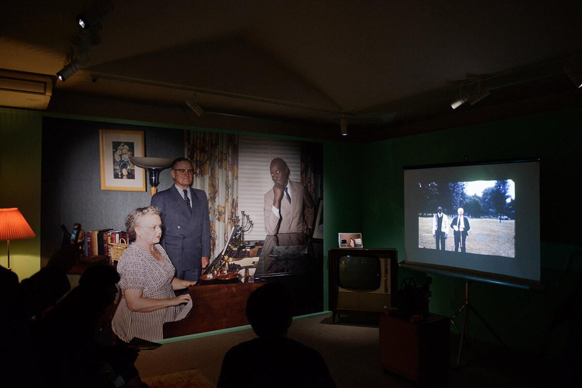 しかし、一点気になることがあった。多くの画面には共通して、ひとりの不在を感じさせるスペースがある。おそらく、その場で「みんなで写真を撮ろうよ」といって、カメラを手に立ち上がった人物が座っていた席や、立っていたスペースが不自然に空いているのだ。人種差別問題や公民権運動が世間を騒がした当時だからこそ、そのスペースに決して写るはずではなかったひとりの黒人の姿を紛れ込ませることで、人種や階級、歴史的排除への強烈な批判を行ったのがこのシリーズだ。